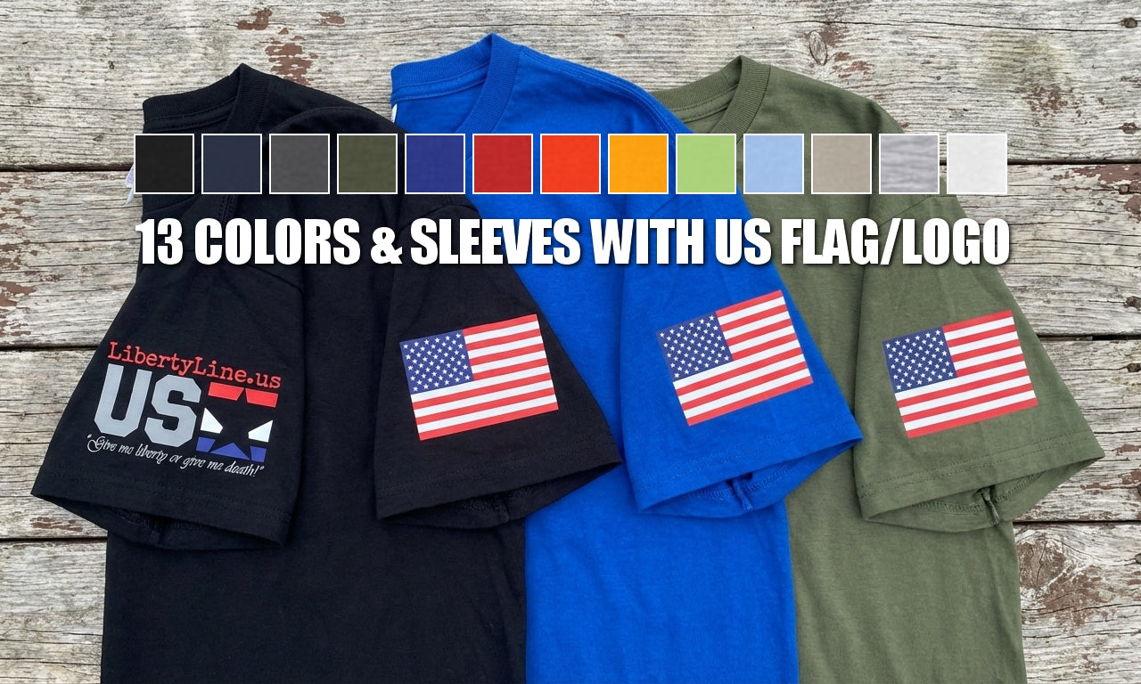 13 colors available and all shirts have US flag and logo emblazoned on the sleeves.